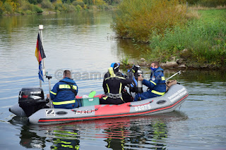 Tauchern des THW Kitzingen gelang es, den PKW an ein Stahlseil anzuhängen, womit es anschließend von der Feuerwehr in Richtung Ufer gezogen werden konnte.